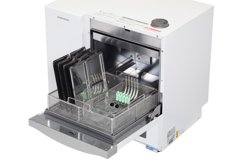 ウォッシャーディスインフェクターは、診療器材の洗浄殺菌を全自動で行う装置です。洗浄液を含んだ常温の水で血液等の汚れを洗い流した後、高温の温水で洗浄、殺菌する装置です。全工程に1時間以上もかけ、全自動で行ないますので均一な安全結果が得られるのが特徴です。この機械で洗浄、殺菌を行なった後にクラスBオートクレーブで更に滅菌を行います。