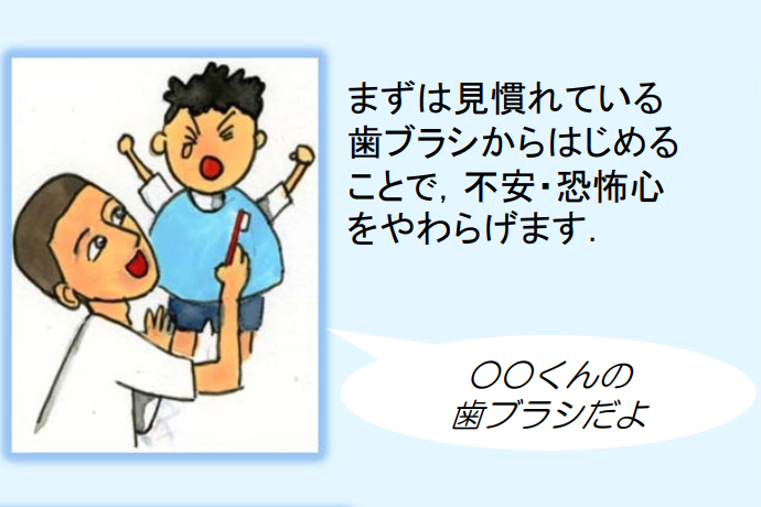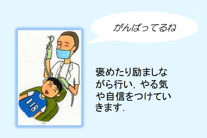簡単なことや刺激の弱いことから始めて、次第に難しさや刺激の強さを上げていく方法です。座って歯磨きができたら、次は診療台に寝ながら歯磨きをしてみる、 それができたら次はミラーで口の中を見せてもらう・・・というように、ステップアップしていきます。