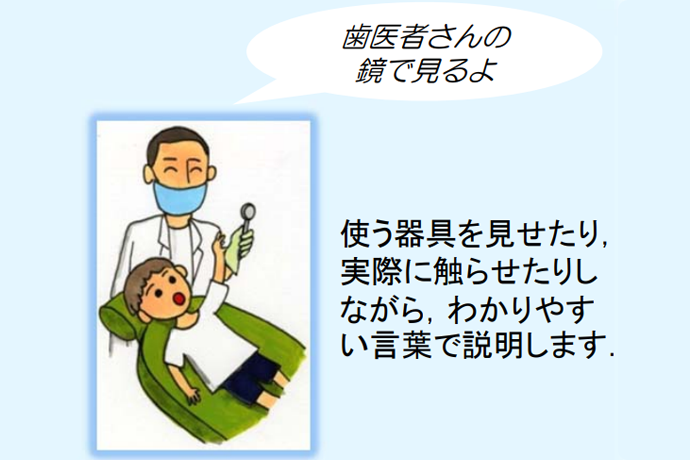 自閉症、知的能力障害などの方で、コミュニケーションがうまくとれない場合は、視覚的にわかりやすく説明をしたり、 数を数えながら終わる時間を見通せるようにしたりする「行動調整法」を用いてできることから少しずつ治療します。