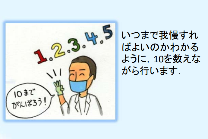 数を数えながら治療を行うことで、終わる見通しを立ててもらいます。今の状態 がどれくらい続くのかわからないということも不安になってしまう要素です。 例えば、「1、2、3、.・・・」と数えながら「10」まで歯磨きすると、「10になると終わる」ということがわかってもらえるので安心につながります。